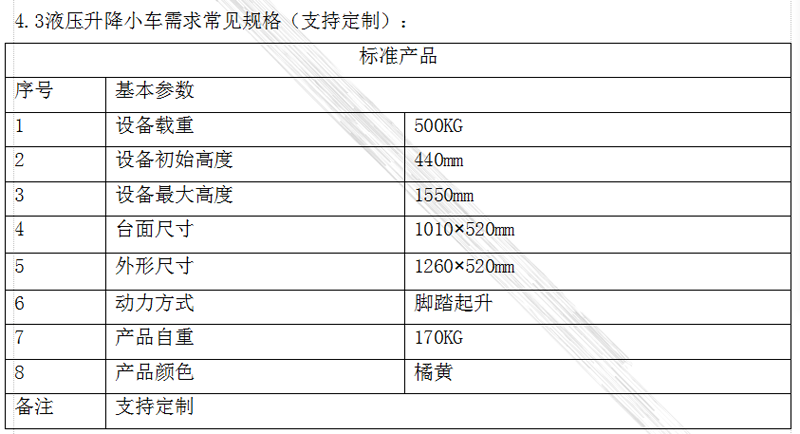 4.2通用結構配置說明:采用冷彎型鋼整體焊接,要求重量輕,強度好。整體時效處理,裝配面、各種孔必須加工。在小車的后端焊接扶手,便于工人移動、操縱裝配小車。小車的升降裝置采用液壓剪刀臂結構。剪刀臂升降需有導向裝置和行程限位裝置,確保升降迅速、平穩、安全。行走系統:車輪材料使用內部鐵芯,外包聚氨酯結構,保證車輪承受重載,運轉靈活輕便,經久耐用。液壓系統:均由液壓缸提供動力。液壓系統壓力、流量均可調節。